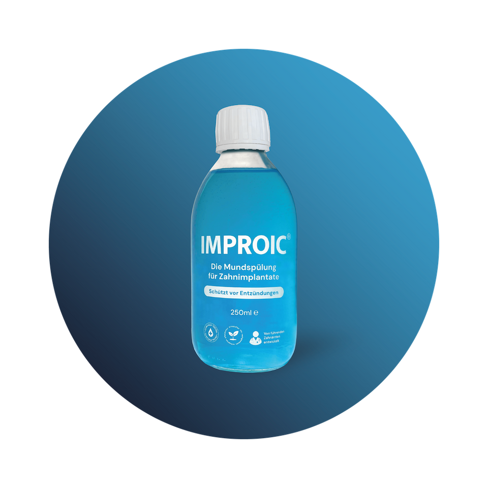 IMPROIC® ist speziell als Mundspülung für Menschen mit Zahnimplantaten entwickelt worden, die ihren Zahnersatz langfristig und nachhaltig reinigen und pflegen wollen. Durch die regelmäßige Anwendung wird die Lebensdauer Ihres Implantats verlängert.